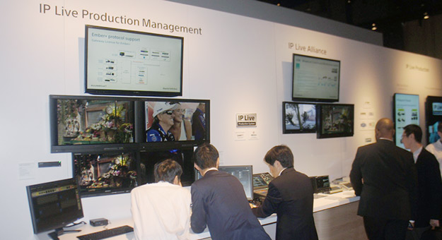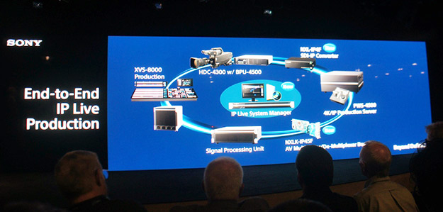 ソニーは、コンベンションセンター周辺のホテルでプレスカンファレンスを開催するのがここ数年来恒例だったが、今年はブース内で発表が行われた。同社は、スポーツやライブ中継などの映像制作おける4K HDRを高効率に制作するソリューションとして、SR Live for HDRに対応した製品や4Kでインフラを構築する際のコストやスペースのほか、機材のリソースシェアや遠隔地からの操作および映像モニタリングを可能とするIP Live Production Systemなどに対応した機器やシステムを提案。