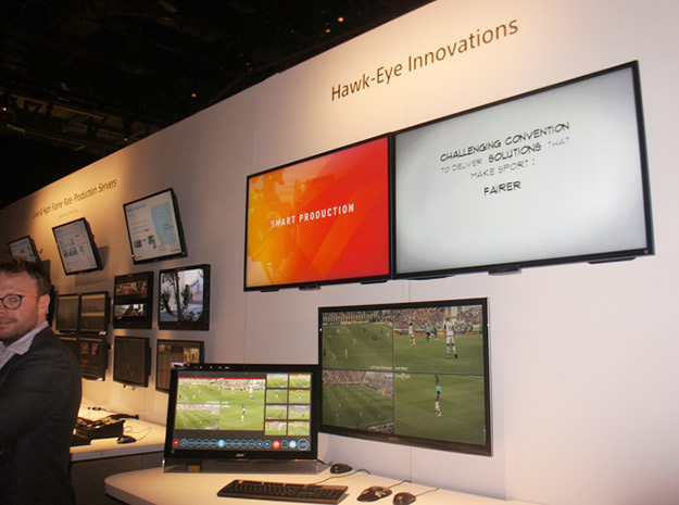取材カムコーダーと連携をするクラウドサービスXDCAM Airやゴールライン判定やマルチカメラ映像を収録し、コーチングなどで使用可能なHawk-Eyeなど実際の運用性を高めるシステム