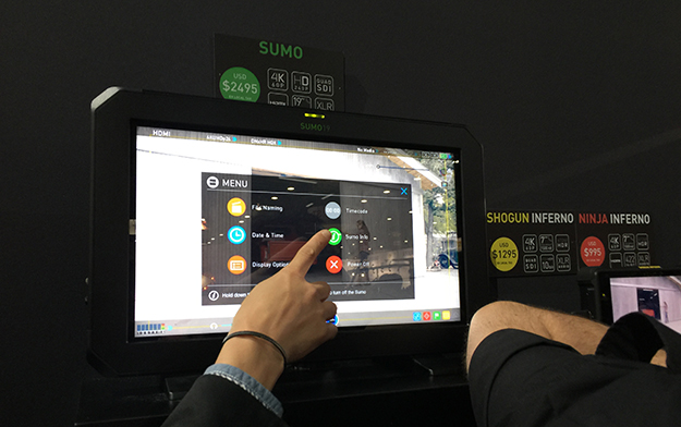外部キャプチャと言えばATOMOSを忘れてはいけない。今回はSUMOと言う名前で19インチ大型パネル搭載のものが登場した。事前情報は何となく掴めていて、多分モックだろうと予想していた。しかし、実機が動いていてビックリ! 操作は今までのものと同じでタッチパネル方式を採用。スイッチャー現場でのPGM録画やクライアントがいるモニター出しの現場にはピッタリはまりそうだ。