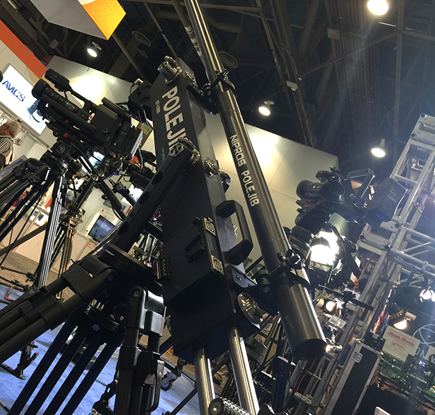 面白い機材を現場目線で作ってしまうことで有名な社長がいるPROTECHは、今回新規にJIBアームを展示。ドライカーボンで制作されたポールの先にリモートヘッド等でカメラを載せるもの。軽量高剛性なドライカーボンとは言え、流石に4m程の長さだと4cm程度しなるのはしかたがないだろう。既に某放送局での実践に使用されており、その動きはかなり良い。独自のカウンターバランスにより確実に角度をホールドできる。今のところ、カメラ重量でこの長さだと2㎏前後がベスト。もちろん、短くすればその耐荷重は増える。価格はまだ思案中とのことだが、この手の機材にしては安価なのは間違いない。