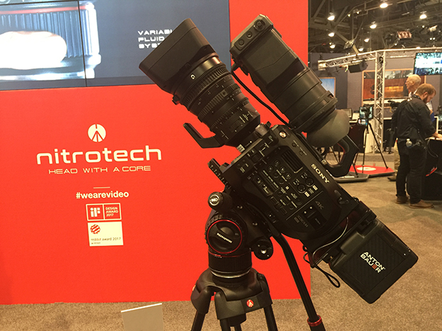 マンフロットからは新しいビデオヘッド、Nitrotechの展示。雲台は、従来のバネではなく窒素ピストンを使ってカウンターバランスを取る方法で、0~8㎏の荷重まで対応する。この0~2㎏以下のカメラがバランス取れるというのは他にはなく、Z150以下のカメラやDSLR系のカメラならこの三脚は間違いないと思われる。では、中型のカメラはどうかといえば、FS7の純正フル装備でもご覧の通り。ドラックゼロでもしっかりバランスがとれる。多分、この重さがMAXだと思われるが、価格を考えれば問題ない。