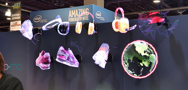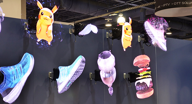 取材を終えてぶらぶらとサウスホールを歩いていると、気になる展示を見つけることができた。パッと見は空中に浮く3D映像である。よく見ると扇風機のようにクルクル何かが回っている。この何かはLEDのひも?のようなデバイスだ。ひも状なので回しても後ろの背景は十分前から見える。またここに映し出された映像はCGで立体的な動きが付いているので、まさにスター・ウォーズでR2D2が映し出したレイア姫のような雰囲気の立体的な映像が映し出されていた。すでにCESか何かで発表されていたようであるが実に注目度の高いサイネージではないだろうか。