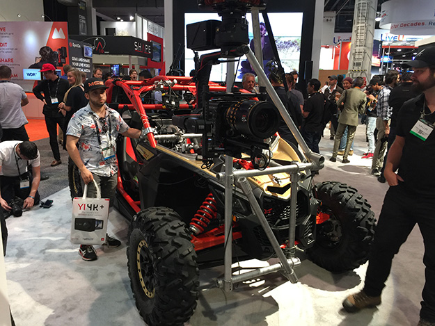 それとは対照的にDJIのブースでの取り付け例は今年はジンバルを装着した2シーターバギー。そしてその二つのブースが隣合っているのが面白い。正に世代交代の縮図なのかもしれない。