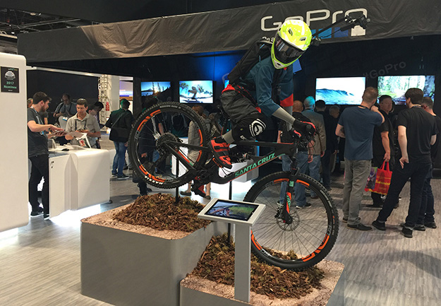 毎年GoProのブースは派手な演出とその装着例に使って居る車両に度肝を抜かれるのだが、今年は遂にこのMTB1台だけ。