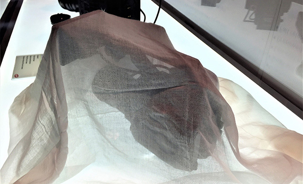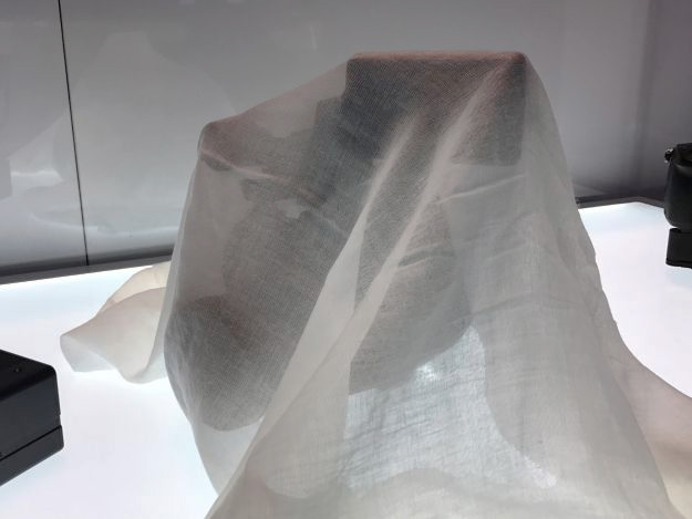初日のPanasonicの発表以来、Facebookのタイムラインでも話題の「ベールを被ったカメラ」は本当にベールを被って展示している。その中身はこんな薄い布切れ一枚でも中々解らないが、筆者が感じるままに伝えるとAF105よりは明らかに大きい筐体にそれなりの太さを持つレンズが付いている。フォーカスリング辺りに赤いラインが付いているが、これはLレンズではなくフェイクだと思われる。そのレンズデザインは青いロゴのレンズに見えるがあのレンズにM4/3マウントってあったっけ?