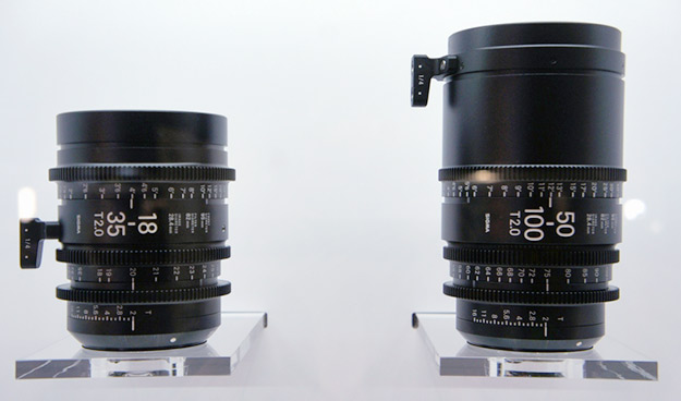 シグマのデジタルシネマカメラ用ズームレンズ。スーパー35mm対応のレンズ18-35mmT2と50-100mm T2の2本と、フルサイズ対応の24-35mm T2.2FFの計3本がある