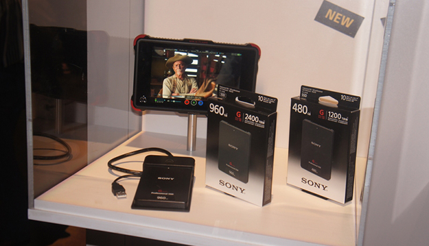 2.5インチのProfessional SSDメディアSV-GSシリーズSV-GS96/GS48。5月発売の新製品で写真のようにATOMOSのレコーダーで実際に動作させていた。転送レートは書込み550MB/s、読み込み500MB/sの高速転送が可能なほか、独自のECC技術により週5回の頻度で全領域を書換えた場合でも約10年間の使用に耐える。