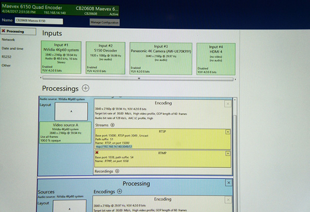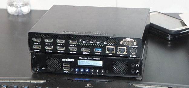 4K×4chエンコーダー&デコーダー&グラフィックスカードMatrox Maevex 6100。4つの入力には4KだけでなくHDやSDなど、異なったフォーマットの混在が可能なほか、それぞれ異なるパラメータの設定も行える