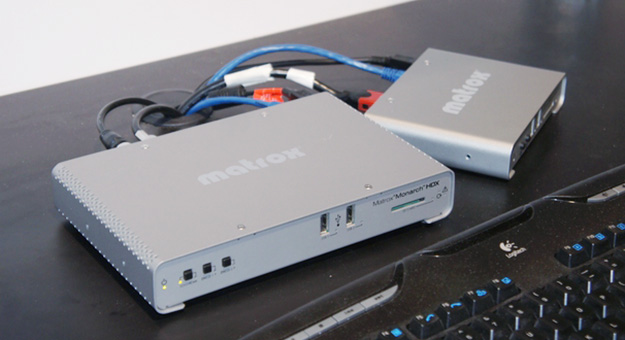 Matrox Maevex 6150。アプリケーションを介してネットワーク全体をPowerStream Plusソフトウェアで監視が行え、ゼロレイテンシーでの伝送が可能。専用のシステムがなくても動作するようにDisplayPort出力と画面のプレビューが可能