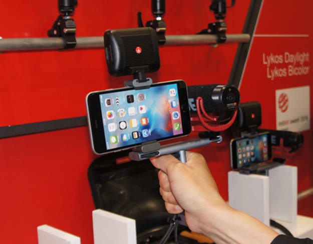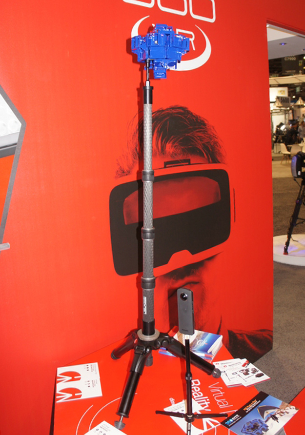 ManfrottoのパートナーブランドとしてVR撮影用のリグを扱う360RIZEより、VR撮影用の三脚を発表。一脚とほとんど同じ作りだが、支柱の扱いが下に行くほど細くなる一脚とは逆の構造になっている。また、近年スマートフォンを使ったニュース取材やブロガーなどが増えており、同社でも対応製品を充実させている。スマートフォンアダプター「TwistGrip」とTバーによるLEDライトやマイクロホンをセットできる製品が出展されていて、Kitとしても販売される。