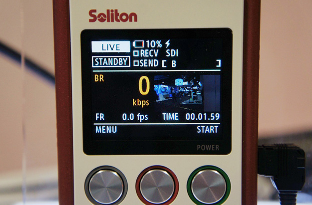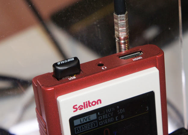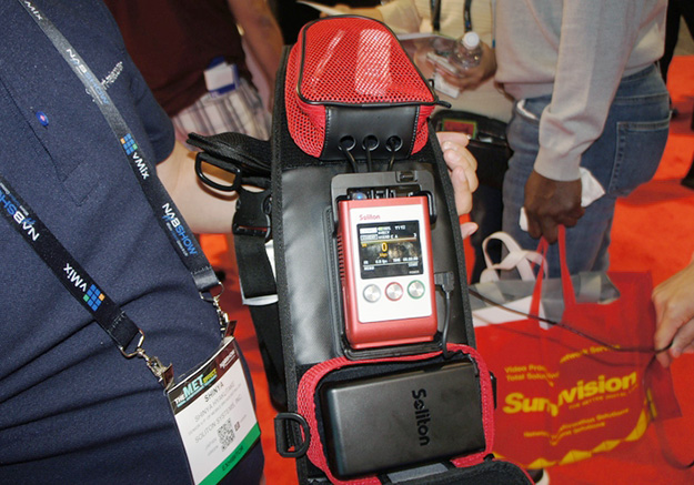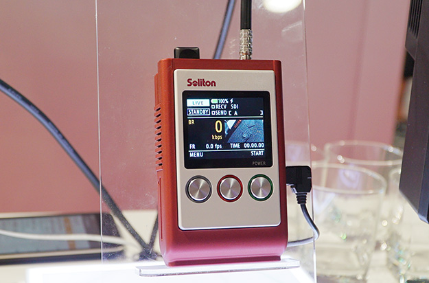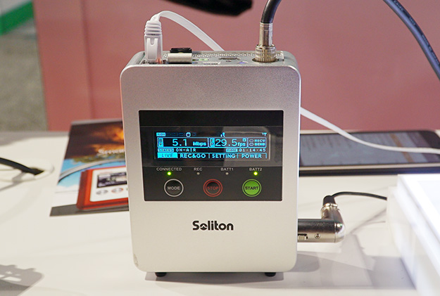ソリトンシステムズはLAN通信のためのハードウェアやソフトウェアを手がけているが、映像伝送システムを10年ほど前に開発し、製品を世に送り出してきた。今回のNABではより小型軽量化を図ったモバイル画像伝送装置Smart-telecaster Zao-Sを出品した。Smart-telecaster Zao-Sは2017年3月に発表になったもので、H.265のハードウェアエンコーダを搭載しており、モバイル回線を3回線束ねることでHD-SDI、HDMI両方の入力映像をワイヤレスで伝送可能。