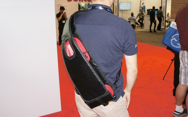 Smart-telecaster Zao-Sを専用のショルダーバッグに収納。上部には各キャリアのモデムの収納が、下部には外部バッテリーなどの収納が可能