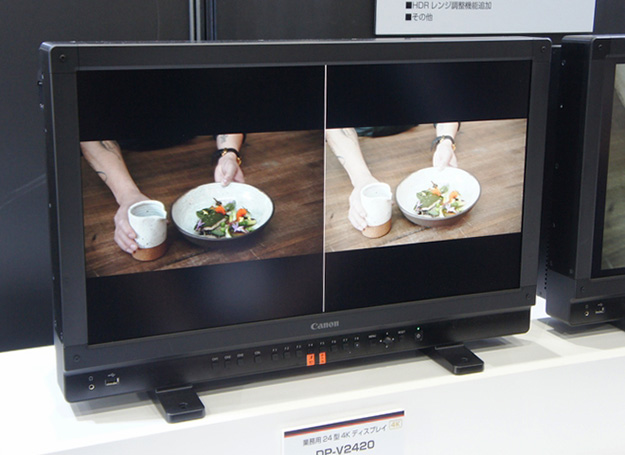 4K対応リファレンスモニターDP-V2420。HDRとSDRの映像を左右に表示可能で輝度レンジや階調のほか、明るさなどの違いを一目で確認できる。EOS C500やEOS C300 Mark IIなどの4K Cinema RAW映像をディベイヤーしてモニタリング可能なほか、カメラのメタ情報を取得してその内容の表示も可能