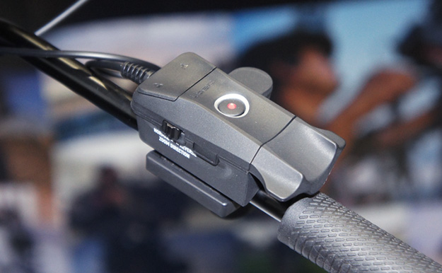 LANC小型カメラ用ズーム&フォーカスリモートコントロールZFC-Lのクランプは最小10mmから最大45mmまで対応。一脚のほかHFMPのグリップにも取り付け可能。ケーブル長は0.7m
