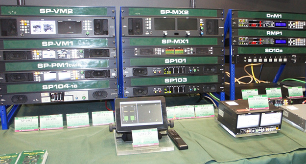 新製品の16チャンネルミキシングオーディオモニターSP-MX1/MX2。左右チャンネル独立で16chオーディオミキシングとch毎のレベル調整が可能なハイパフォーマンスのオーディオモニター。そのほかにも各種オーディオモニターを出品