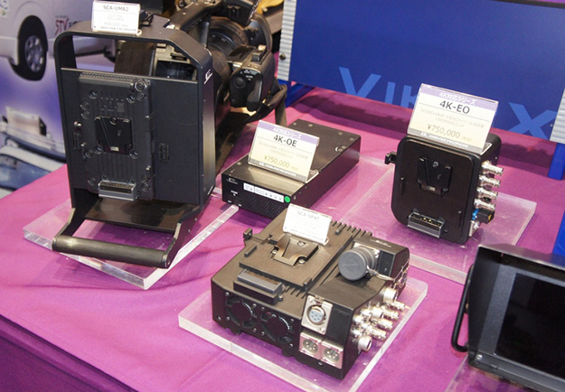 参考出展の12G/4KミニコンバーターUMCシリーズ。分配/フレームシンクロナイザ/音声MUX・DEMUX/光ファイバー伝送/フォーマット変換など11機種をラインナップ。いずれも単体バッテリー運用のほかラック搭載が可能
