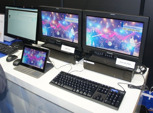 送り返し用超低遅延IP伝送システム。MMTとHEVCを採用した送り返し用のエンコーダー、デコーダーシステムでオンエアの映像をインターネット回線を使って低遅延で送り返しが行える。送り返しの映像はタブレット端末などで確認可能