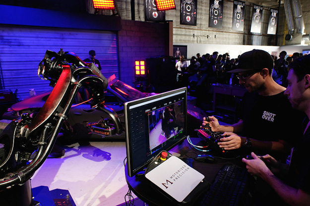 REDのテストシューティングブースに、車のカスタマイズ工場をモチーフにしたセット。火花が散るグラインダーの溶接部分のアップをロボットアームに取り付けられたREDカメラでコントロールしながら撮影を体験できる