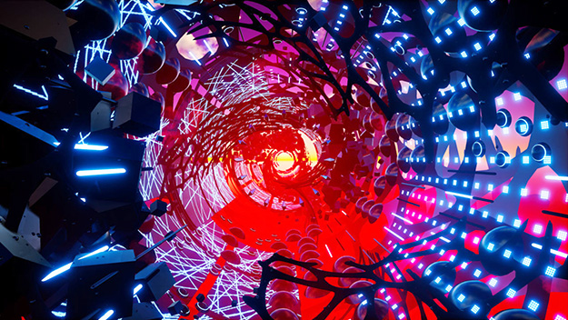 往年のデモシーン風、サイバーなクラブ会場を探索するような映像コンテンツ。