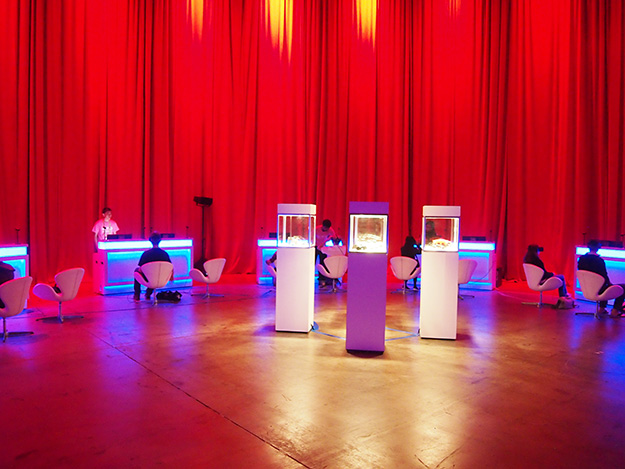 VRシアターでは、20組の完璧にセッティングされたVRヘッドセットと、映像にビックリしても転ばずに安心して視聴できるゆったりとしたイス、それにヘッドセットの装着や、ヘッドフォンの装着などを手助けしてくれる専任のスタッフなど、数分から数十分たらずのVR視聴環境をスムーズに行うための準備が整っていた。おまけに時代が早すぎて流行らなかった任天堂バーチャルボーイや現状のVRブームのきっかけとなったOculus DK1など往年のVR機材の展示がなされていた。上映はスクリーニングAの組と、スクリーニングBの組に分かれて視聴することとなった。