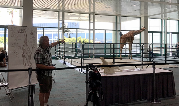 Gary Geraths氏によるスケッチ講座は、数十席用意されたワークショップが毎回満席の人気で、キリンの骨格や筋肉の構造、動物ならではの動きなどの特徴を分かり易く解説しながらのワークショップであった。