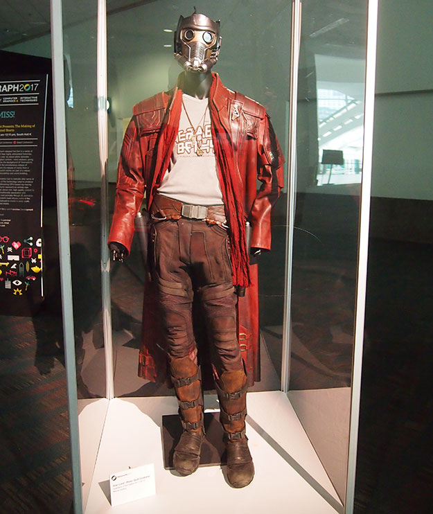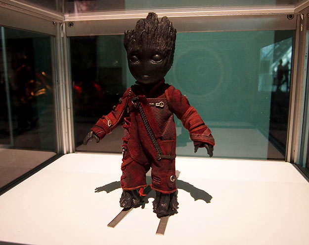 「ガーディアンズ・オブ・ギャラクシー」の衣装と、木のキャラクター「グルート」の模型