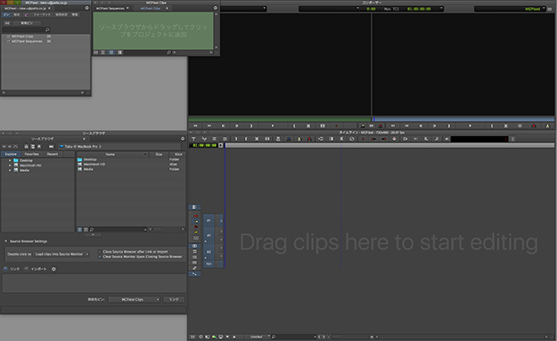 MCでは作業内容によってどちらの考え方で素材を読み込むか選択できるようになっている。 ソースブラウザで読み込むフィアイルを選択し、画面左下の「リンク」または「インポート」を選択する。