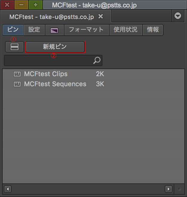画面左上に配置されているプロジェクトウィンドウにある「ビン」タブ(1)をクリックすると既に作成されてるビンのリストが表示され、「新規ビン」(2)をクリックしてビンを追加することができる。