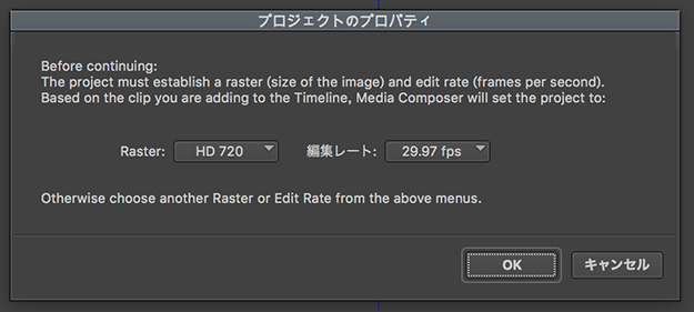 現在編集しようとしているクリップの画角とフレームレートが選択されているので、基本はそのまま「OK」をクリックして良いだろう。MCFでは1920×1080までにサイズが制限されている。ちなみに、まだシーケンスを作成していない状態でファイルをインポートしようとした場合も「プロジェクトのプロパティ」ウィンドウが現れる。