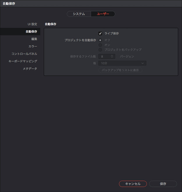 「ライブ保存」機能は、「環境設定」→「ユーザー」タブ→「自動保存」にある