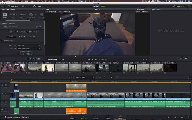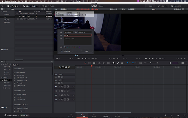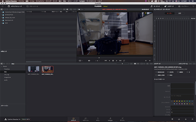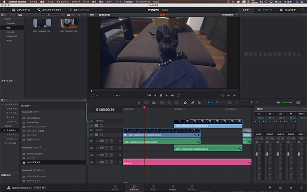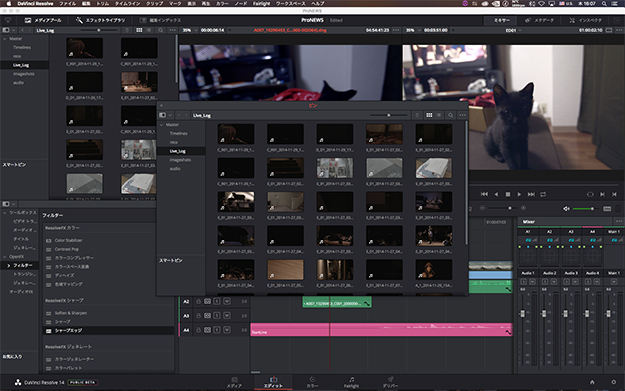「エディット」ページでの新機能で注目は、前述と同じになるがパフォーマンスのアップである。編集技師として編集ソフトを扱う上でそのレスポンスというのはかなり重要である。単純にレンダリングが速い、いろいろなエフェクトや便利機能などが注目されがちであるが、「編集」という作業の中では、素材を選びスペースバーを押して再生し、イン点アウト点を設定し、タイムライン上にクリップを並べていく作業が多くの割合を占める。Resolve 14で刷新された再生エンジンは、スペースバーを押した瞬間に再生を開始する。他のどのNLEよりもレスポンスが良いのではないかと思う。