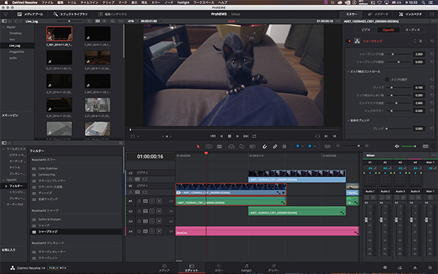 「エディット」ページで「OpenFX」のシャープエッジを適用。DaVinci Resolve 14では「エディット」ページで「ResolveFX」を適用することができるようになった