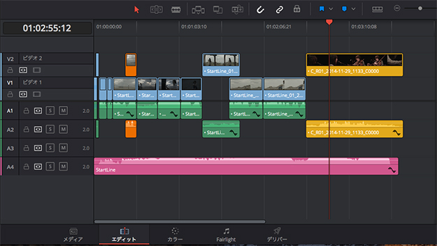 ビデオトラックでは素材の種類によってクリップの色を変え、音声トラックでは音声の種類でダイアローグ、SE、MEで色を変えるなど、よりタイムラインを見やすく管理することができる。
