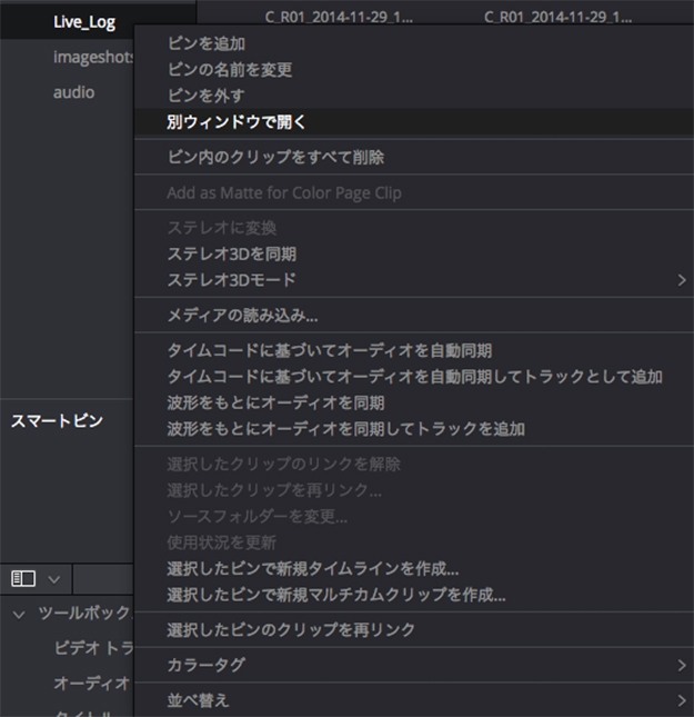 次に挙げるのが、ビンを「別ウインドウで開く」という機能。Adobe Premire ProやFinal Cut Pro 7を使っているユーザーからすると、何を今更という機能だが、12.5までのResolveでは画面左上の「メディアプール」と呼ばれるウインドウで素材を管理検索する過程で、細かく分けたビンを都度都度必要なビンを開いていかなければならなかった。細かいがかなり便利になったと思われる。