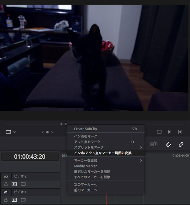 「イン点/アウト点をマーカー範囲に変換」で、デュレーションマーカーに変換することが可能