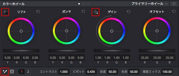 左下のスポイトのアイコンが新しく追加されたホワイトバランスの機能。また、リフトとゲインの左上に自動調整機能を搭載した