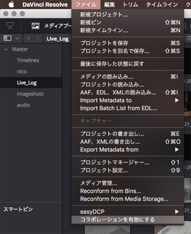 さて、編集ソフト、カラーグレーディングソフトしての注目の新機能を紹介してきたが、Resolve14の新機能では、「コラボレーション」という機能が大きな注目を集めている。Studio版(AppleのAppStore版は除く)のみに搭載されている機能で、簡単にいうと、一つのプロジェクトを複数台のマシンで同時に開き、複数人で共同作業ができるというものである。