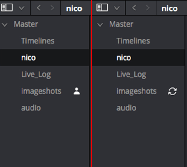 ビンを分けて作業することで編集、グレーディング、整音どの作業も共同に行うことができる。他のユーザーによる変更がされたビンには更新マークが点灯し、それをクリックすることで更新を反映することができる。例えば、アシスタントエディターがインタビュー素材にデュレーションマーカーで使いどころのピックアップ作業をしながら、完了した部分からエディターが編集を始める、というような形や、長編のタイムラインを素材や場面ごとにアシスタントがLUTを適用していき、カラリストは本編先頭からグレーディングを開始→適宜クリップサムネイルの更新ボタンで適切なLUTが適用されたクリップをロードして作業を進める、などさまざまワークフローが考えられる。