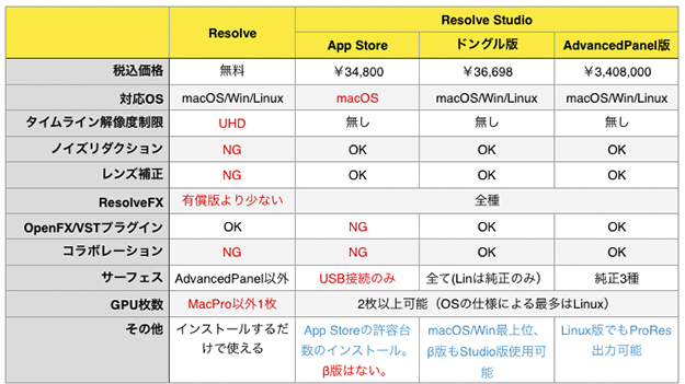 ただしmacOS版のみであるが、AppleのAppStoreで売られているStudio版はAppStore由来の制限が多く、Advanced Panel付属のLinux版を含めると、実質は4種類のResolveが存在することにはご注意いただきたい。