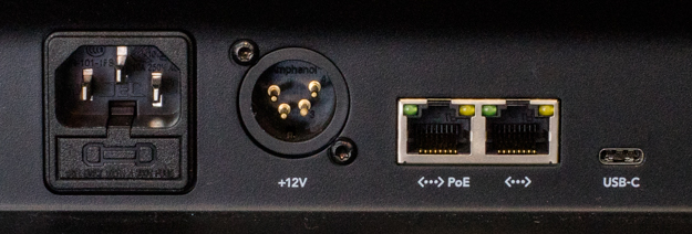 接続はUSB-C、Ethernetのどちらかに対応する。電源は、AC100V、4ピンXLRでのDC12v、PoEとかなり柔軟性が高い。ワークステーションを別の部屋に置いているようなスタジオでも同一LANのEthernetがあれば接続できる。4ピン12vで駆動できるというのは、バッテリー運用も可能ということで、機材車の中に設置なども現実味がある。