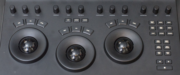 手前の部分には、リフト、ゲイン、ガンマのホイールとボール。プライマリに相当するコントラストやミッドトーンディテール、彩度などのソフトノブ、グラブスチルや全ノードのバイパス、1ノードの無効化などのボタン、また再生制御などが並ぶ。