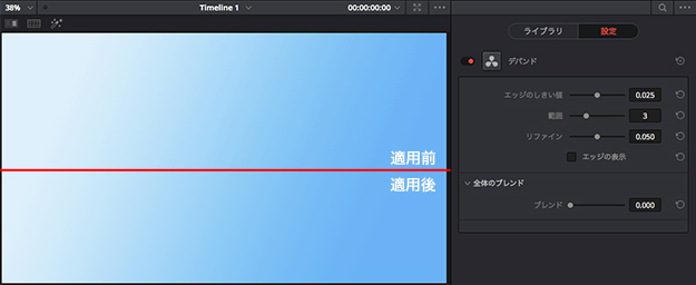 DSLRやAVCHD素材など8bitの高圧縮がかかった映像や、Canon Log 2など8bitのLOG素材から大幅にコントラスト調整をした場合に現れやすい、マッハバンド。グラデーションに縞上の模様が出てしまい、困った経験がある方は少なくないのではないだろうか。従来は軽くノイズを加えたりなどで目立たなくすることも多かった。このプラグインで、全てではないが、ある程度のバンドは補正可能。
