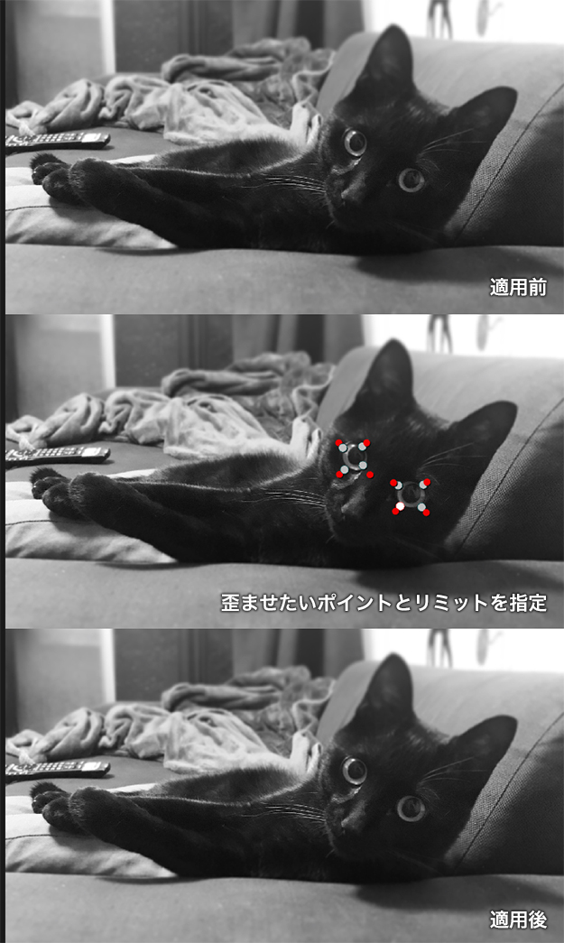 映像の一部分を指定し、歪ませる機能。ビューワ上で動かしたい部分をポイントを指定し、その部分をドラッグすることで映像を歪ませる。ビューティーワークのみならず、マイクバレの修正や、レンズなどの歪みの補正などさまざまな応用ができそう。