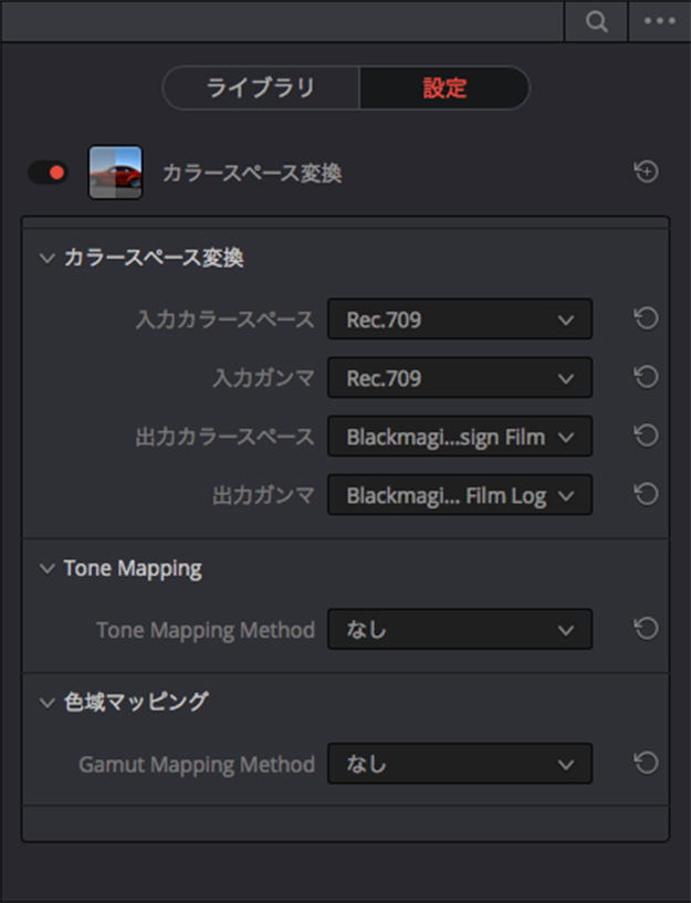 特定の色域から別の色域への変換ができる。「LUTでいいのではないか?」とも思われるかもしれないが、例えば、追加撮影で急遽違う種類のLog収録された素材があったとして、他の素材と同じLUTを適用したい!などの場合に、Canon LogからBMD Filmに変換し、そのあとのノードでLUTを適用、という使い方も可能。Resolve Color Managementをオンにするほどでもないけど、ちょっと最初から色を寄せておきたい場合に手軽に変換に使えて地味に便利。