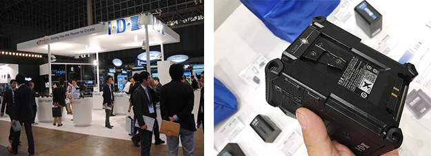 一押しの新製品は進化したDUO-Cシリーズバッテリー「DUO-C198」と「DUO-C98」。セルをハイパワー化し、カメラの動作時間の延長を実現。10段階の残量表示でバッテリー交換時期をより細かく分かるようになっている。また、カメラビューファインダーでの残量表示可能が行え、V-Touch搭載により10秒間だけ光るLEDライトにより暗いところでのバッテリー装着をサポートしてくれる。