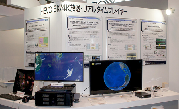 HEVCによる4K/8K放送リアルタイムプレイヤー。HEVCのMain420/422 10プロファイル対応で60fpsも可能。TMCブース