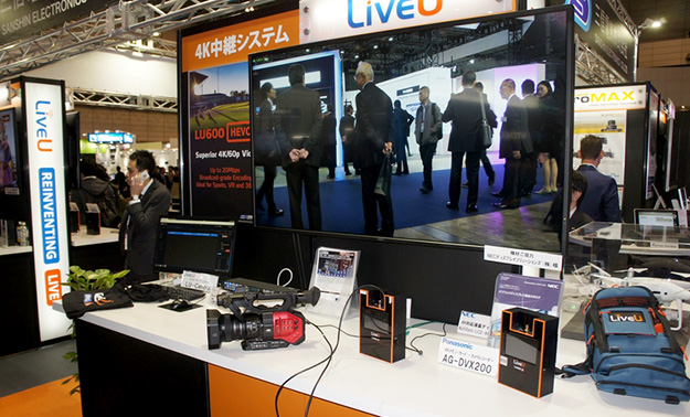 LiveU社製品による4K中継システム。3G、4G、LTE、BGAN、Wi-Fiなど複数の回線を束ねて使用し、HEVCによる圧縮コーデックを採用することで4K60p伝送に対応。三信電気ブース