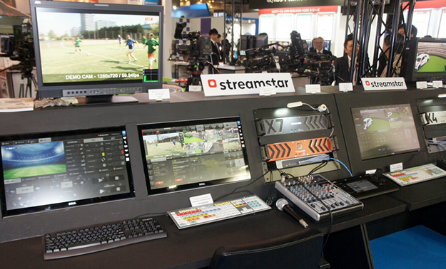 スタジオから撮影現場のカメラをIP制御し少人数で効率的な運用が可能なスポーツ中継システム。JVCのカメラとStreamstar社のライブプロダクションシステム X7/X4/X2組み合わせたシステム。JVCケンウッドブース