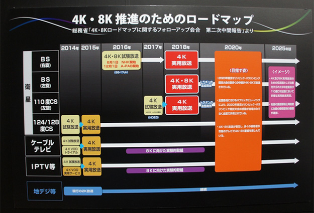 4K/8K推進のためのロードマップ。4Kはすでにスカパーで放送開始されているが、来年からBS衛星を使ってBS朝日、BSジャパン、BS-TBS、BS日本、BSフジなどが本放送を開始する予定。来年からの8K放送は今のところNHKのみ