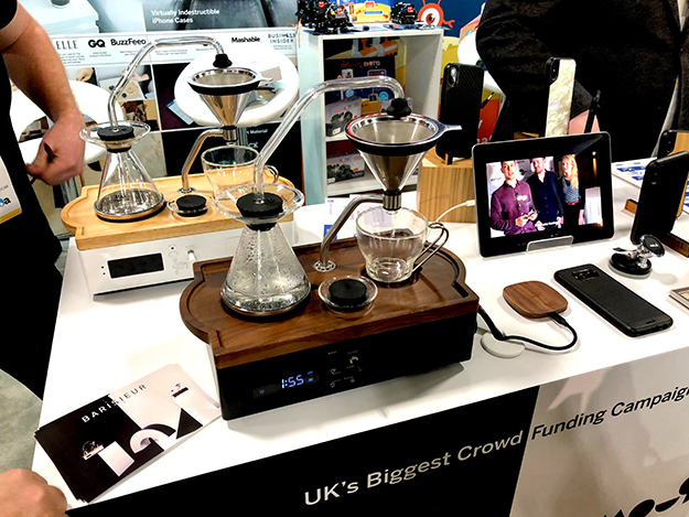 「BARISIEUR」は2016年にクラウドファンディングで話題になった「コーヒー目覚まし時計」だ。いよいよできあがった商品版が今年のCESに展示されていた。仕組みとしては非常に単純で、寝る前にコーヒーを挽いてフィルタに入れ、水をポットに入れておき、目覚まし時計をセット。起きる時間になったら勝手にコーヒーを淹れてくれる、というそれだけのものだ。アイデアだけを聞くと、なんというかとてもアイデア一発の「ネタウィジェット」にしか聞こえないのだが、実際に目にすると、侮れない気がしてくる。